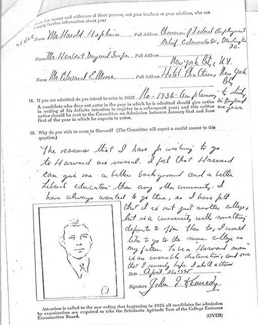 为了迎接肯尼迪遇刺事件50周年纪念,《华盛顿邮报》着重展示了他的许多学校记录,包括一封手写的哈佛申请。你可以在肯尼迪总统图书馆和博物馆查看电子版原件。